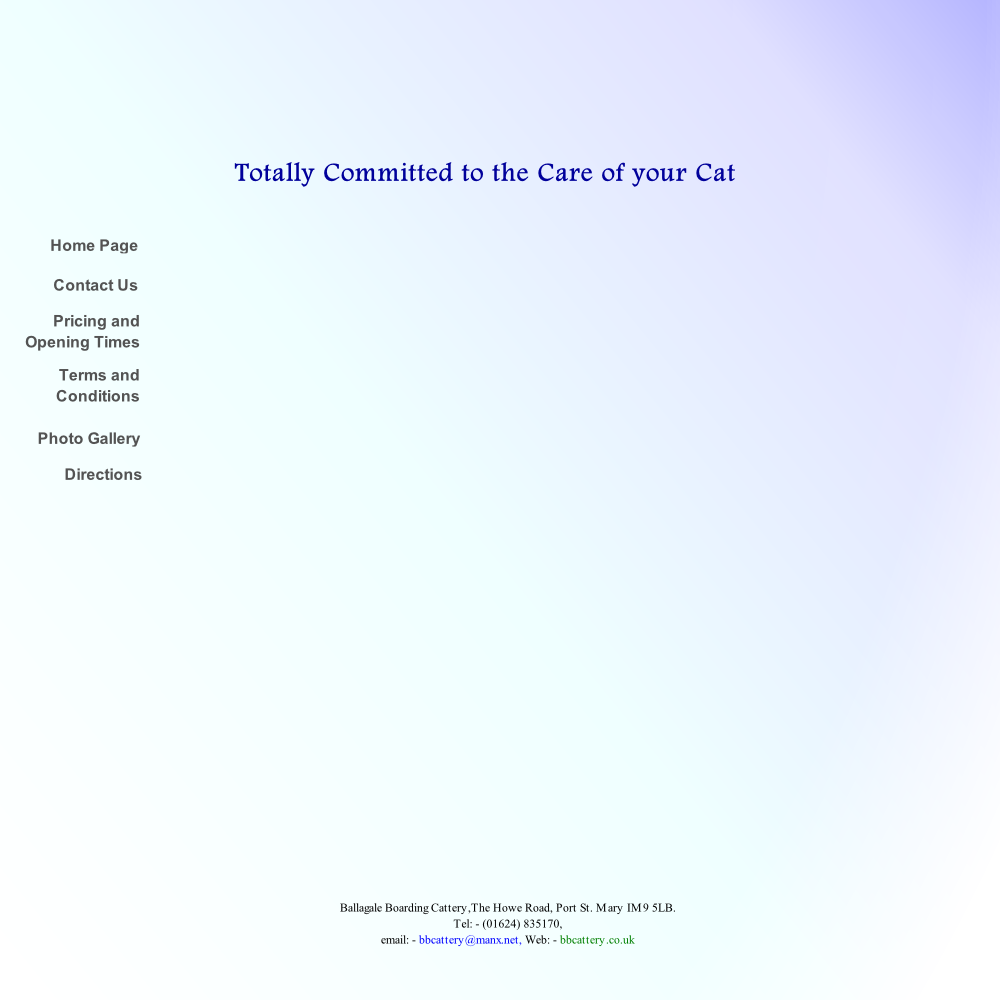Home Page Situated on a main road makes finding us very easy. Parking is available right outside. There are 24 individually heated Chalets of varying sizes with sizable exercise runs. All Chalets can take 2 cats, with some able to take up to 3 cats from the same household. We also have 2 family chalets, which are able to take up to 6 cats each. Please see Photo Gallery for further pictures of the Cattery. We look forward to welcoming you all. Please don’t hesitate to contact us by phone or email. Visits, by appointment, are highly recommended. Ballagale Boarding Cattery, situated in the South of the Isle of Man (near Port St. Mary),  is a family run facility, established in 2007, set in a quiet semi-rural location, ensuring your cats experience peace and tranquility during their stay.